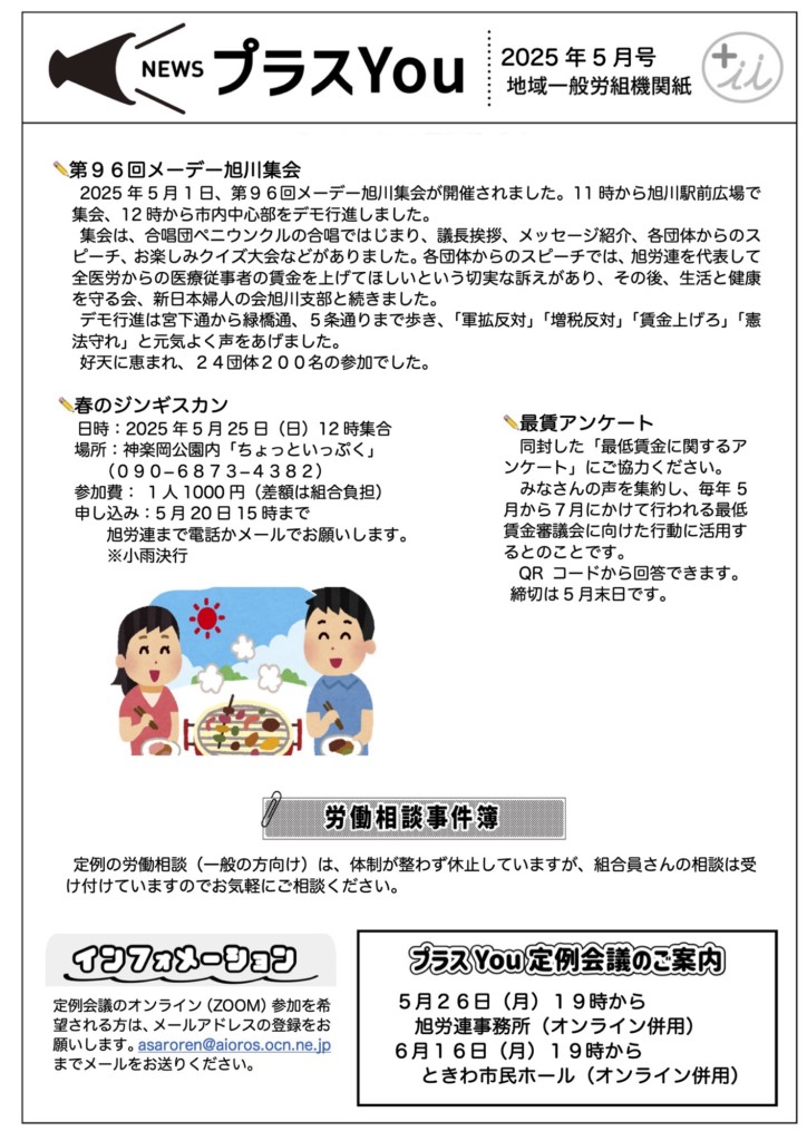 旭川地域一般労働組合 プラスYou 旭川市豊岡1条1丁目4-11 旭川労働センター (0166)34-8315